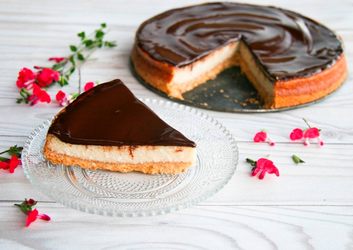 - Versez votre appareil au tofu soyeux, sur la pâte de biscuits, et enfournez environ 45 à 50 minutes. Le centre de votre cheese-cake doit être légèrement tremblotant. Sortez du four et laissez refroidir complètement. Préparez le nappage. Cassez le chocolat dans un bol, ajoutez la crème de coco et faites fondre au bain-marie ou au micro-onde. Une fois le chocolat fondu, remuez à la spatule. Versez le nappage au chocolat tièdi sur le cheesecake et placez au réfrigérateur au moins 2H00.