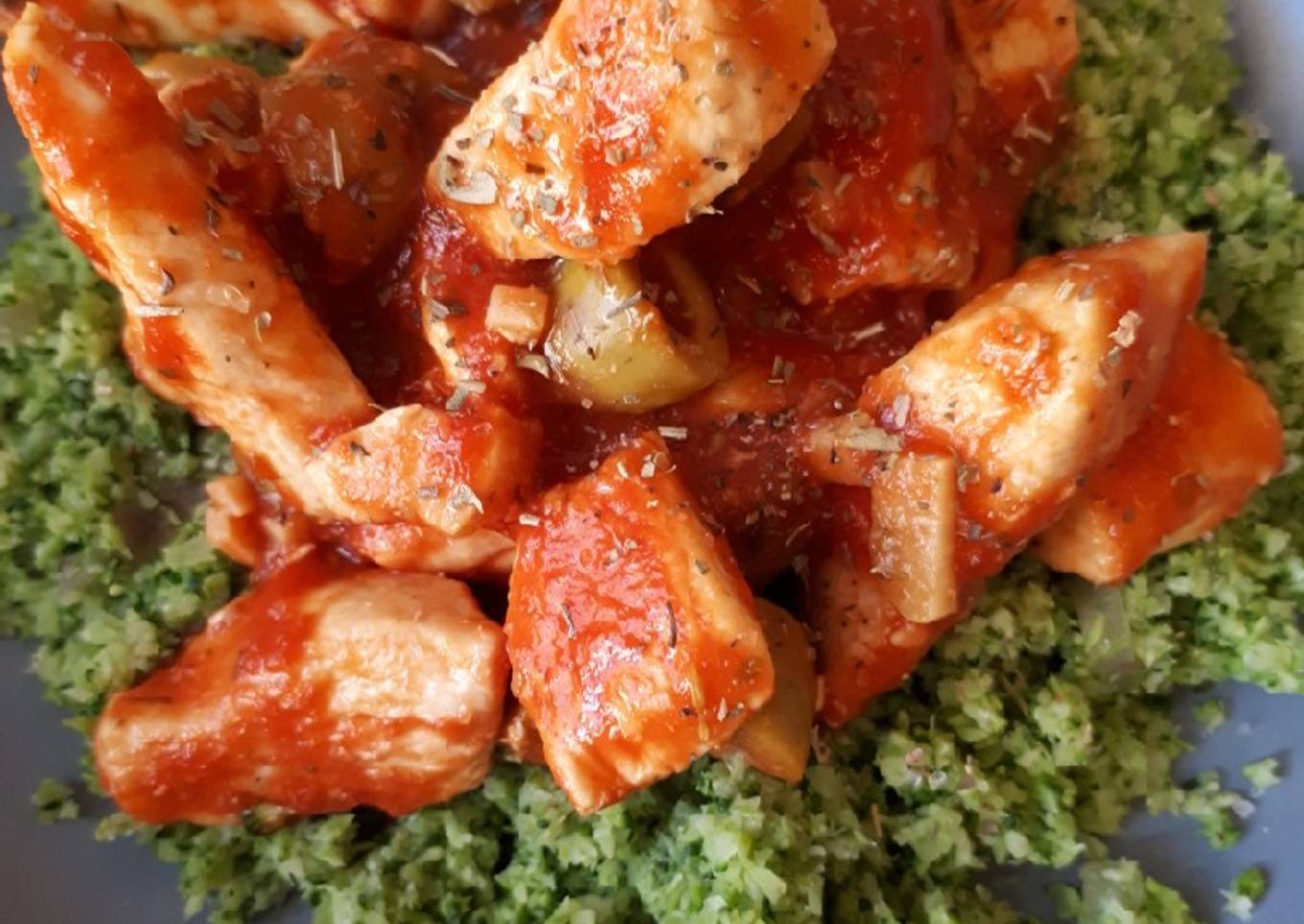 - Dans une assiette, mettre la semoule de brocolis et ajouter du poulet tomate/olives. C'est prêt