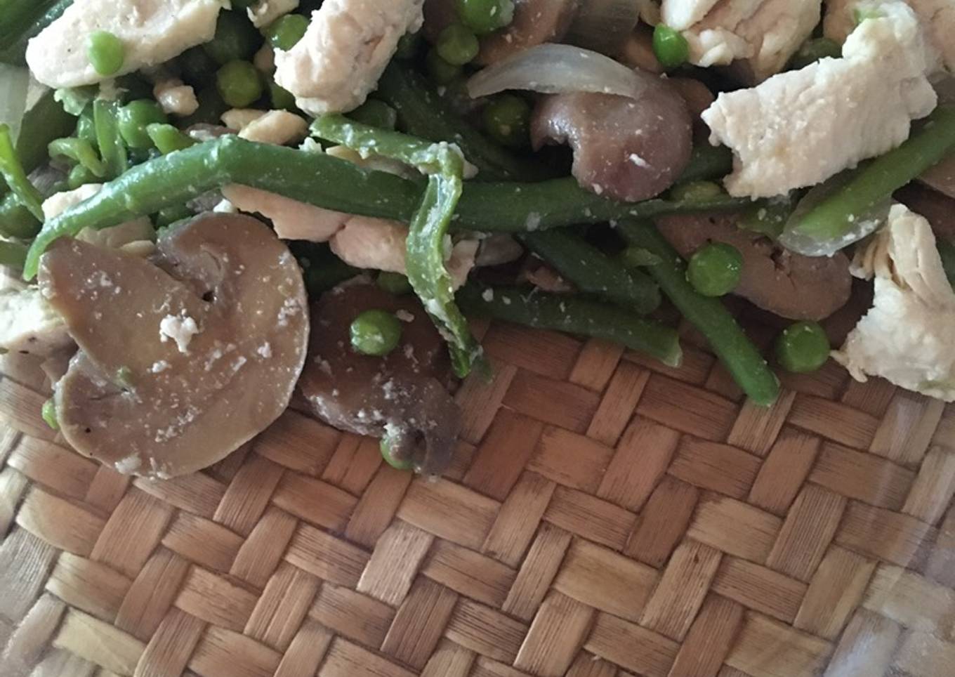 - Faire rougir l’ail et l’oignon et rajouter l’haricot vert et les petits pois puis les escalopes poulet cuit et les champignons