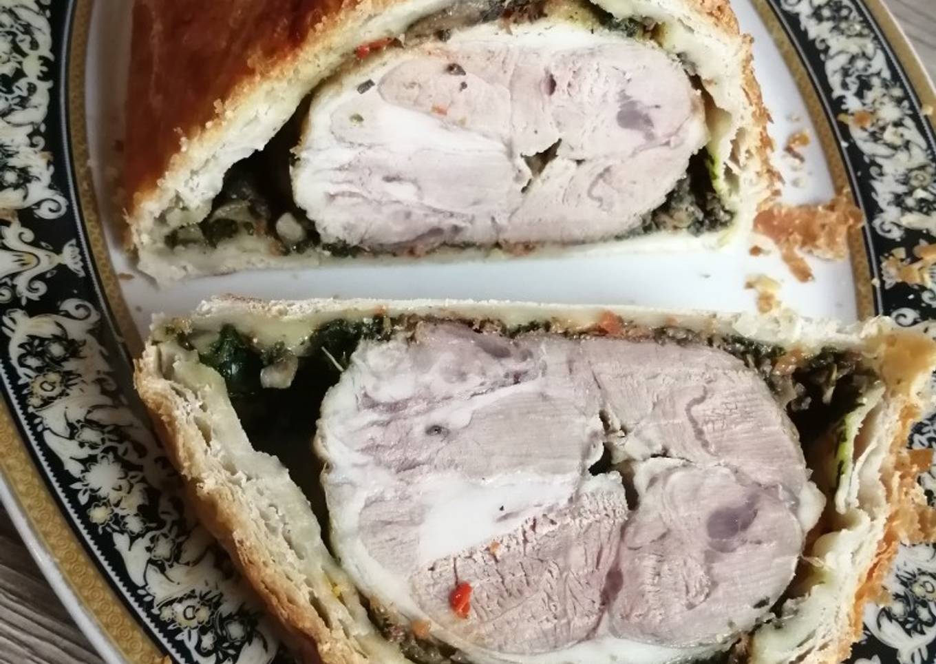 Une farce très savoureuse envellope le gigot avec les épices champignons herbes aromatiques le tout chemiser avec une pâte feuilletée un régal
